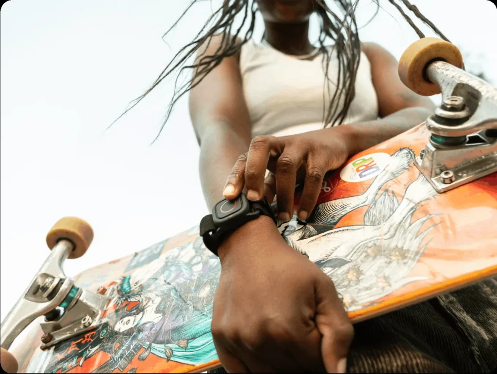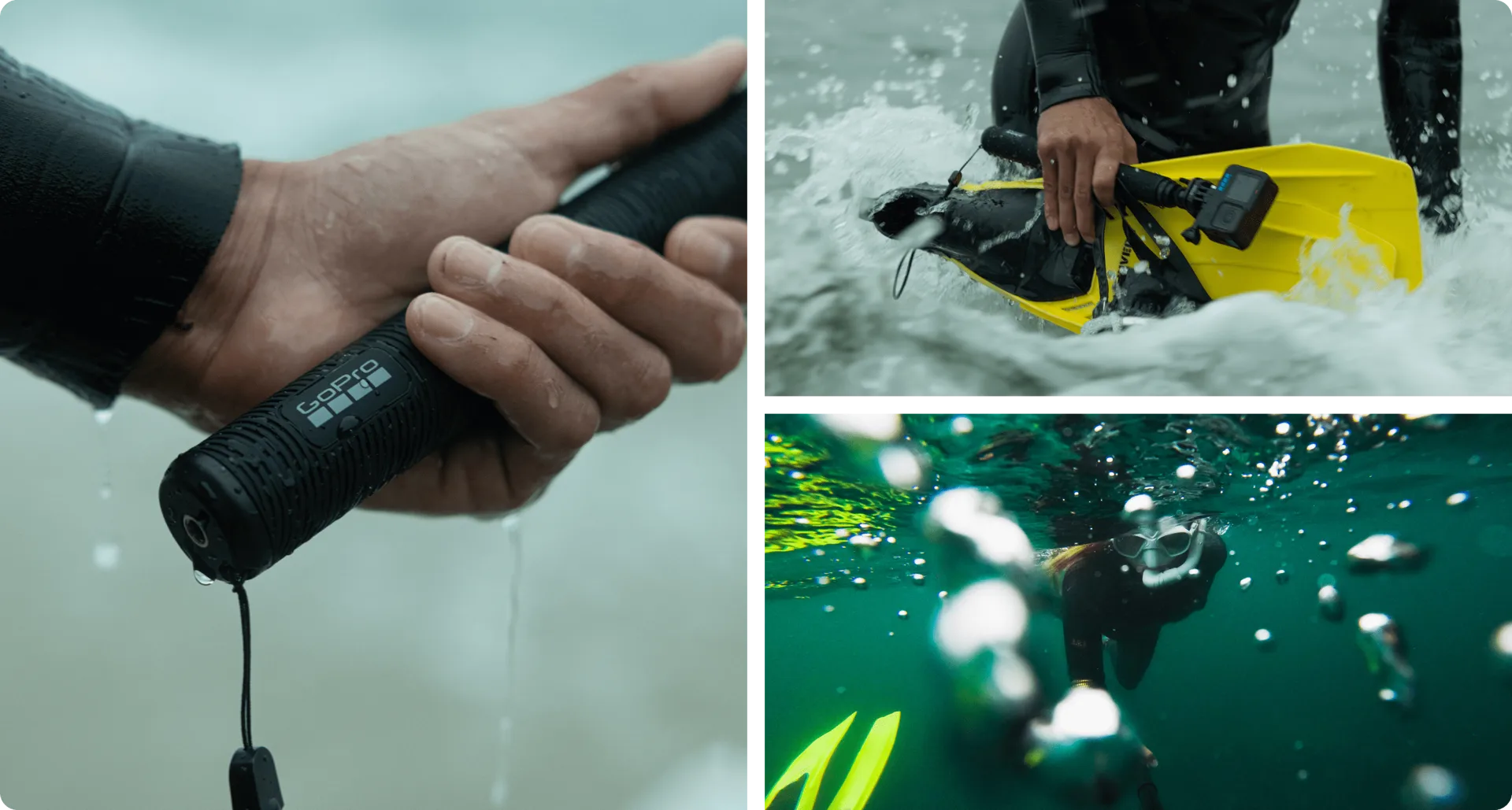 Usa la extensión de correa para muñeca incluida para colocarte el mando a distancia con obturador en la muñeca de forma segura y grabar sin sujetar la vara. El mando a distancia también es sumergible hasta 5 m¹.